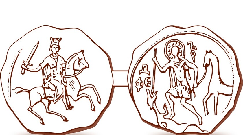 Однако на Руси сюжет всадника, убивающего змея, появился гораздо раньше. Так, в середине 13 века на оборотной стороне печати Александра Невского был изображен святой Феодор Стратилат, который вонзает копье в открытую пасть дракона.