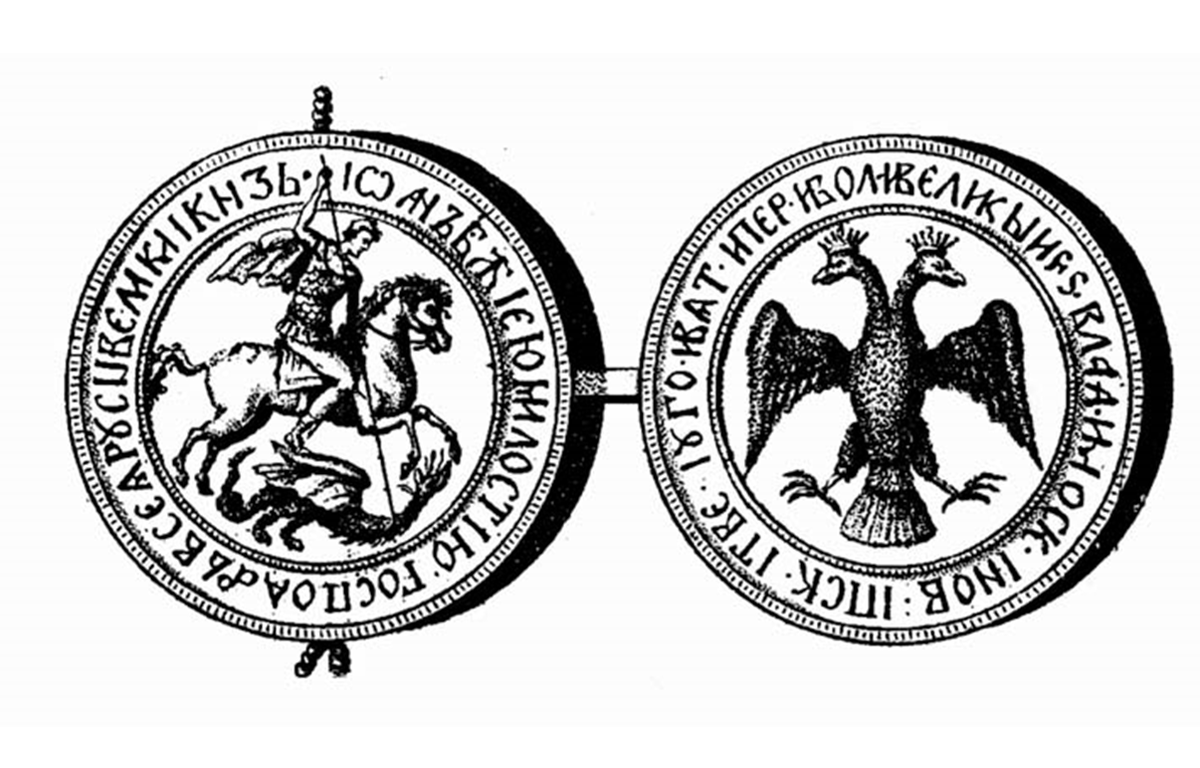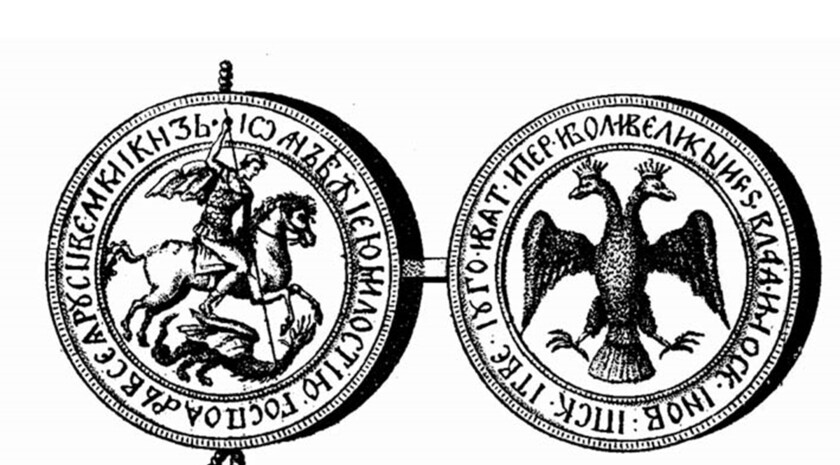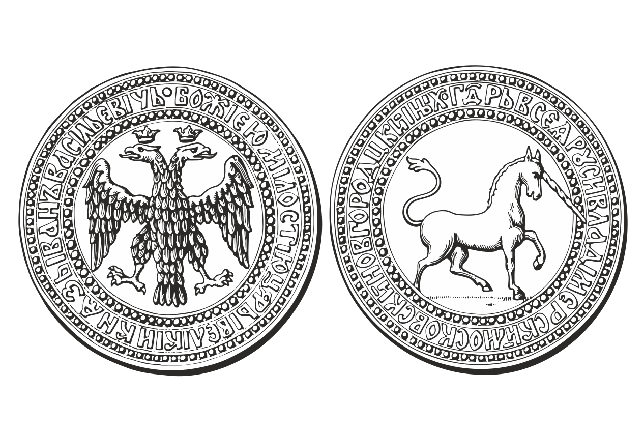 В ходу были и другие образы — например, всадника с соколом, единорога или льва, терзающего змею. Только в середине 15 века, при Иване Третьем, змееборец окончательно утвердился в качестве герба. Его изобразили на печати государя. На ее вторую сторону тогда же нанесли другой знак — двуглавого орла.