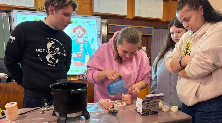 После теоретической части для участников провели мастер-класс по переработке старых свечей. Студенты на практике освоили процесс переплавки парафиновых огарков и создали новые свечи. Такой формат помогает молодёжи осознать ценность вторичного использования материалов.