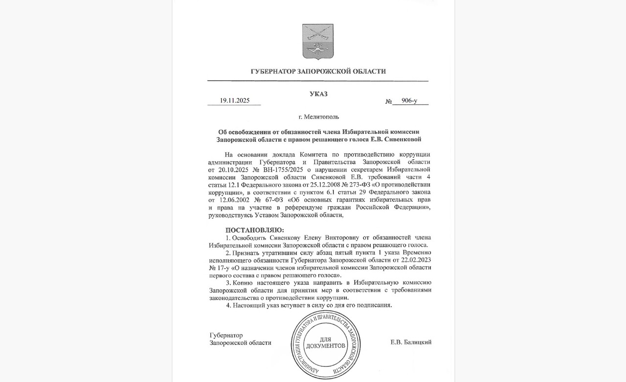 «На основании доклада комитета по противодействую коррупции администрации губернатора и правительства Запорожской области от 20 октября 2025 года о нарушении секретарем Избирательной комиссии Запорожской области Сивенковой Е.В. требований части 5 ст. 12.1 федерального закона „О противодействии коррупции“ <…>», — гласит пояснительная часть документа.