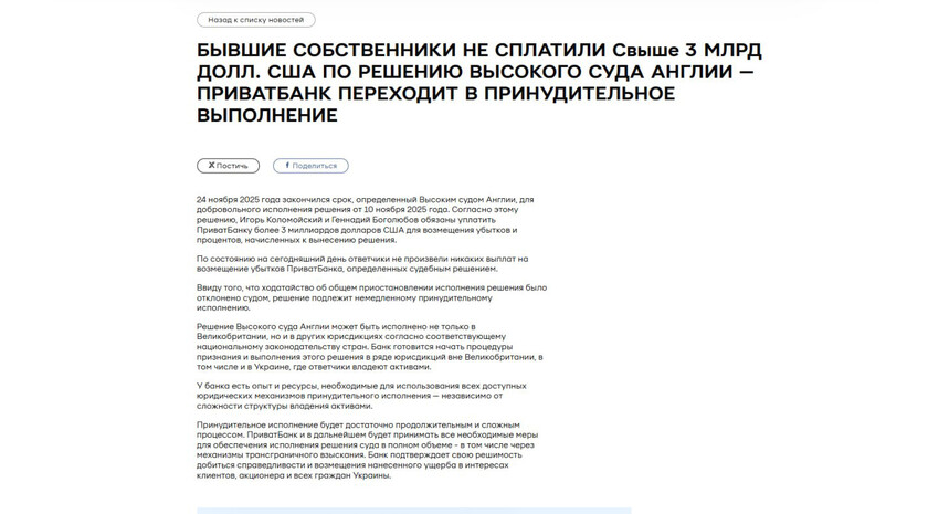 «24 ноября 2025 года закончился срок, определенный Высоким судом Англии, для добровольного исполнения решения от 10 ноября 2025 года. Согласно этому решению, Игорь Коломойский и Геннадий Боголюбов обязаны уплатить ПриватБанку более 3 миллиардов долларов США для возмещения убытков и процентов, начисленных к вынесению решения. По состоянию на сегодняшний день ответчики не произвели никаких выплат на возмещение убытков ПриватБанка, определенных судебным решением», — говорится в сообщении кредитной организации.