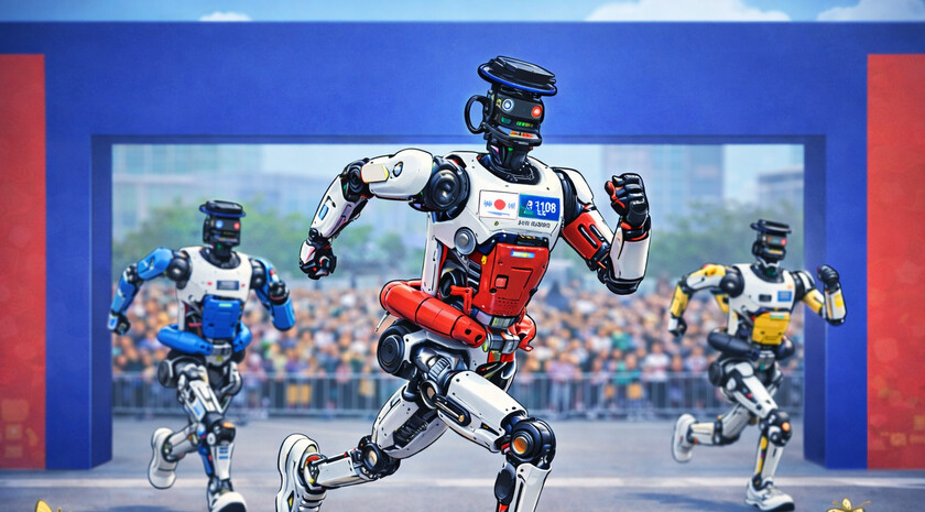 В забеге на 21,1 километра участвовали более 32 тысяч спортсменов и свыше 300 человекоподобных роботов из более чем 100 команд. Люди и машины бежали по одному маршруту, но для роботов была предусмотрена своя «выделенка», и они стартовали поочередно с интервалом в 30 секунд.