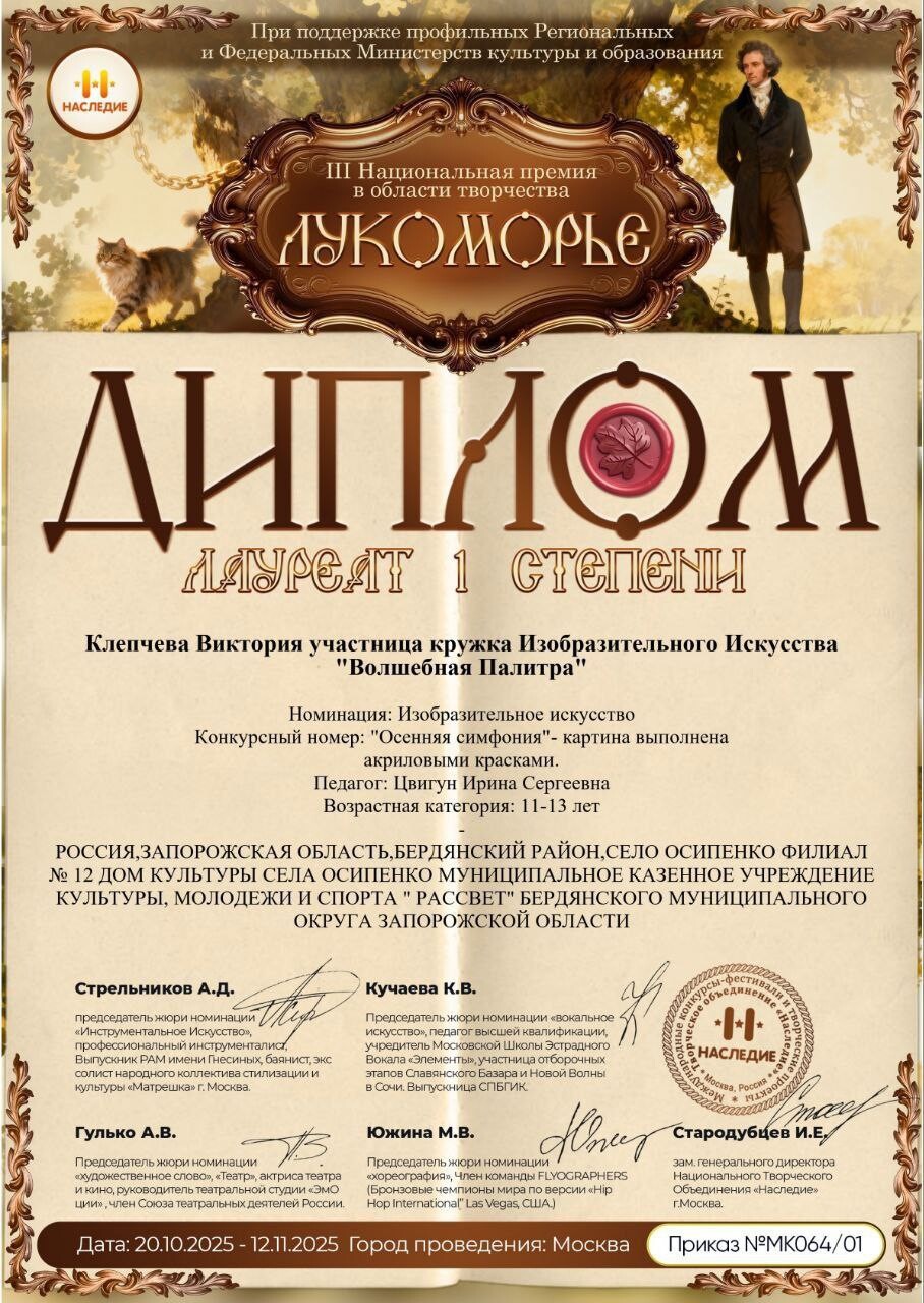 Воспитанница кружка изобразительного искусства «Волшебная палитра» Дома культуры села Осипенко Виктория Клепчева стала лауреатом сразу двух крупных всероссийских творческих фестивалей. Об этом сообщила пресс-служба администрации Бердянского муниципального округа.