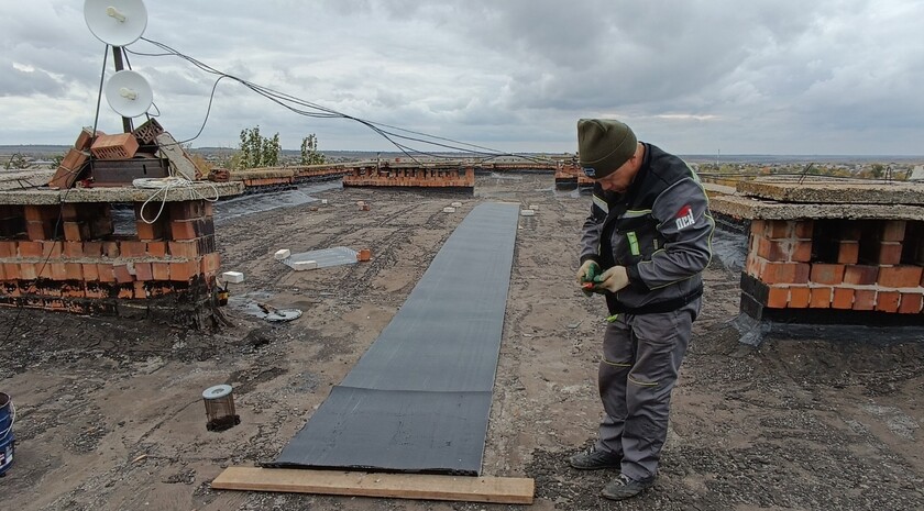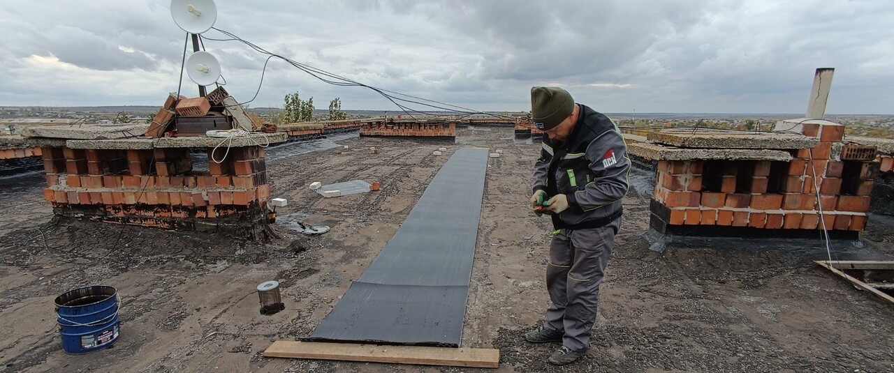Рабочие уже положили около 150 кв. метров новой мягкой кровли, осталось завершить еще порядка 60 кв. м. По его словам, специалисты применяют современный гидроизоляционный материал — линокром, который обеспечивает прочную защиту от влаги, осадков и перепадов температур. Ранее рабочие отремонтировали примыкания к парапетам и вентиляционным шахтам.