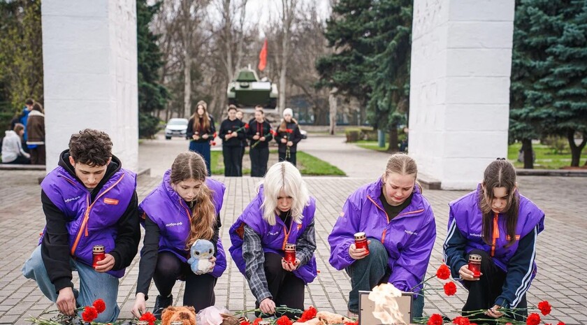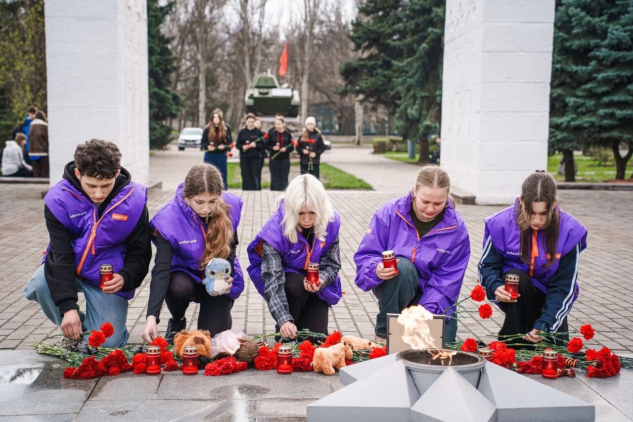 Активисты молодежного движения «Юг Молодой», волонтеры регионального штаба #МЫВМЕСТЕ и активисты «Волонтеров Победы» возложили цветы к Вечному огню на мемориальном комплексе «Братское кладбище» в Мелитополе.