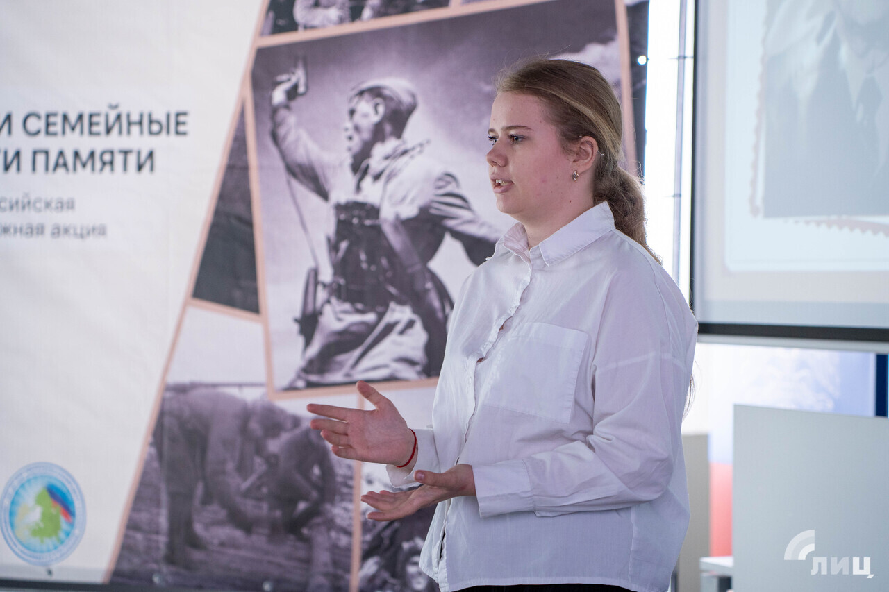 Молодые люди выступили с короткими рассказами, в основе которых — истории из семейных архивов об их прабабушках и прадедушках, внесших вклад в Великую Победу.