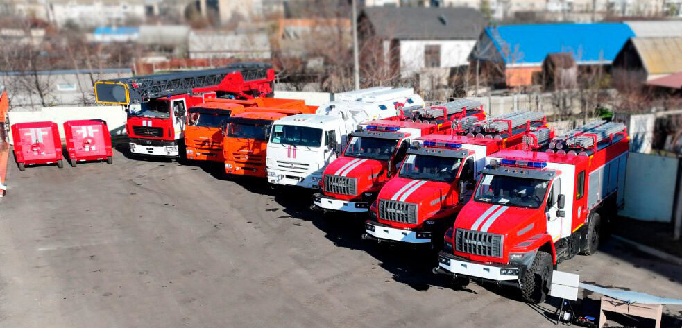 Также подразделения получили два пожарных бронещита для защиты личного состава от ударной волны, осколочного поражения и высокотемпературного излучения на опасных объектах, специальную передвижную мастерскую с кран-манипулятором для диагностики, технического обслуживания и ремонта пожарных и специальных автомобилей в полевых условиях, два самосвала на базе «КАМАЗ» грузоподъемностью до 15 тонн, шесть беспилотных авиационных систем вертолетного и самолетного типов.