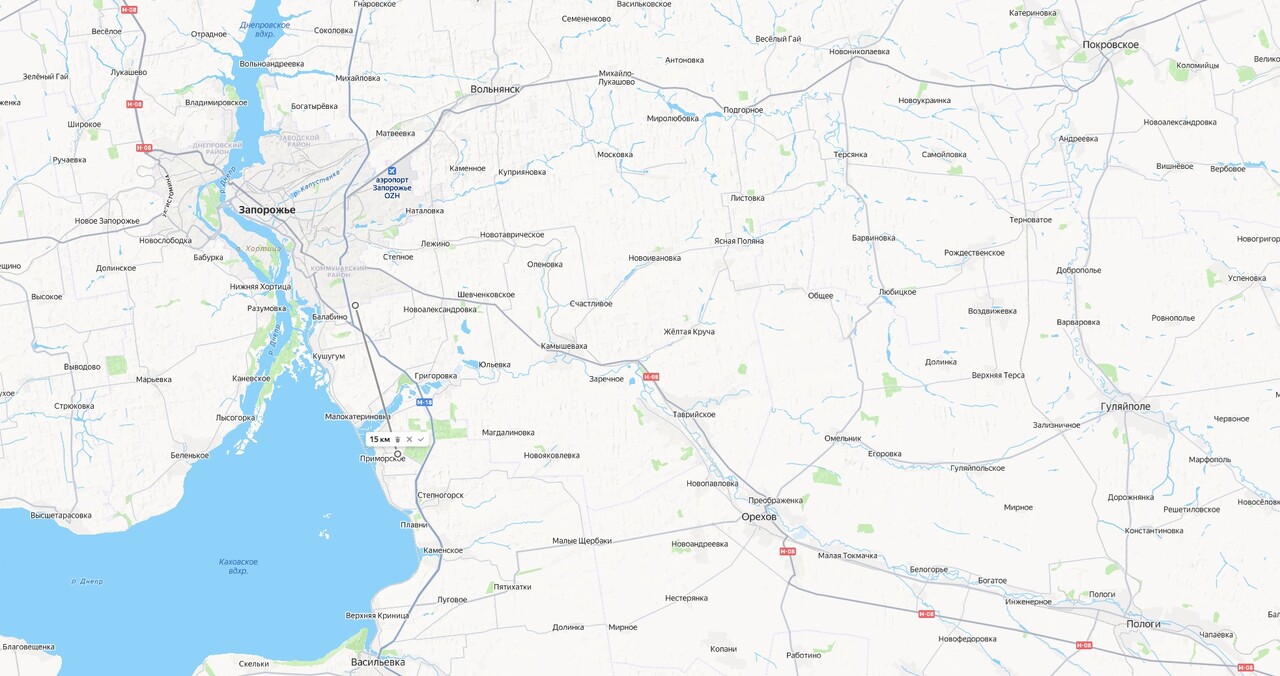 Российские военнослужащие находятся в 15 км от южной окраины города Запорожья. Об этом доложил Президенту России Владимиру Путину командующий группировкой войск «Днепр» генерал-полковник Михаил Теплинский.