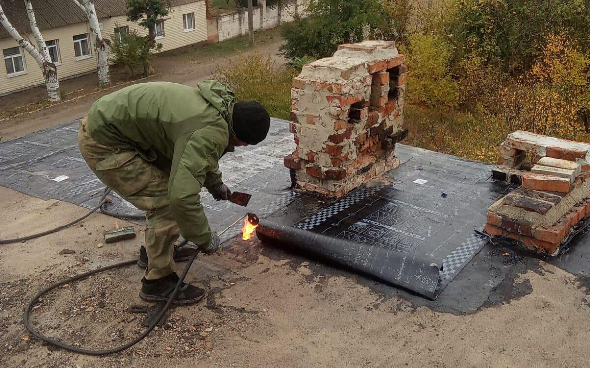 На участке площадью 23 квадратных метра было демонтировано старое покрытие, выполнено выравнивание цементной стяжкой и нанесена грунтовка для усиления гидроизоляции. Дополнительно рабочие устранили повреждения изоляции вокруг дымохода, заделав щели и трещины цементным раствором.