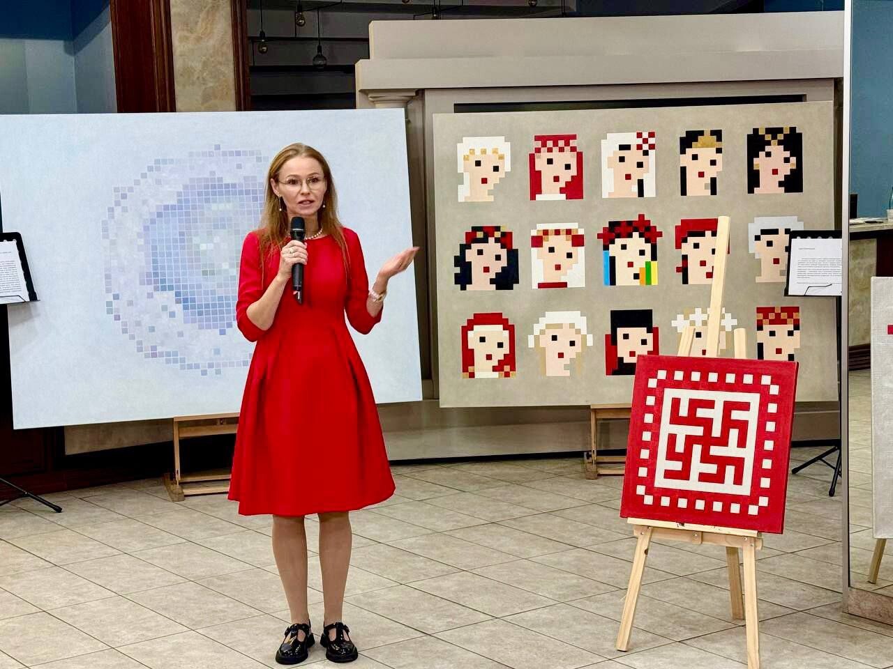 «В своем проекте „Великая Фрагментация“ художница представила синтез славянских орнаментов и цифрового пикселя. В основу легло исследование принципа множественности Вселенной, что отражено в сюжетах и технике растровой живописи, где отдельные элементы в своей совокупности создают единый гармоничный образ», — отметили в министерстве.