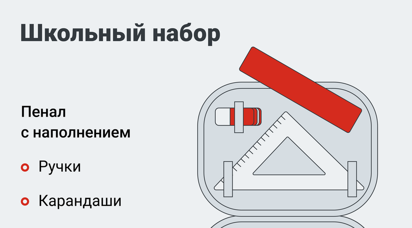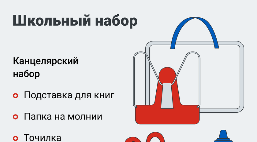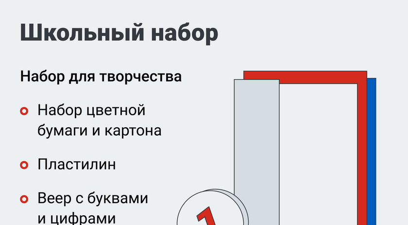 От «Движения Первых» первоклашки получат рюкзак, дневник, полный канцелярский набор школьника и набор для творчества, а также мешок для сменной обуви; «Народный фронт» добавил к набору плотные тетради с обложками; АНО «Россия — страна возможностей» — набор наклеек; Российское общество «Знание» — школьный пенал с наполнением и иллюстрированное издание графических новелл о Героях специальной военной операции. Выдача школьных принадлежностей начнется с 1 августа, этим займутся участники «Движения Первых» в школах новых регионов страны.