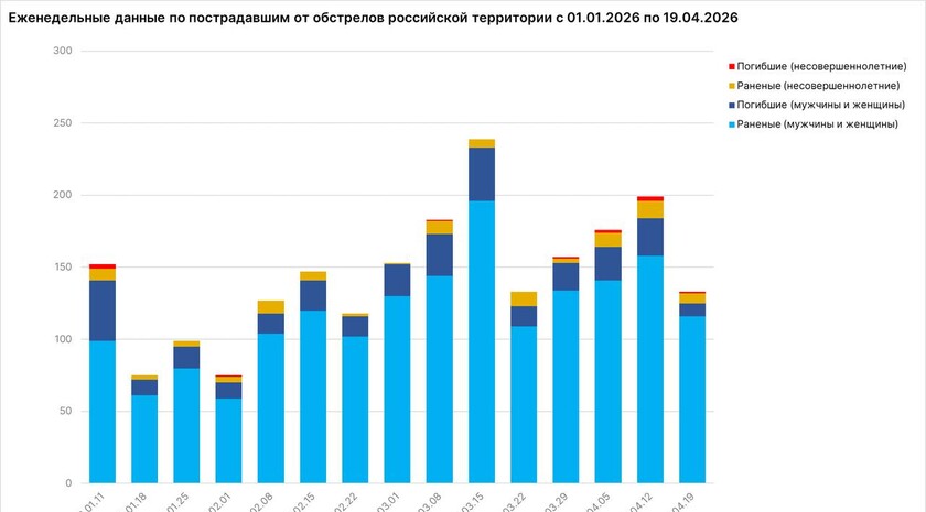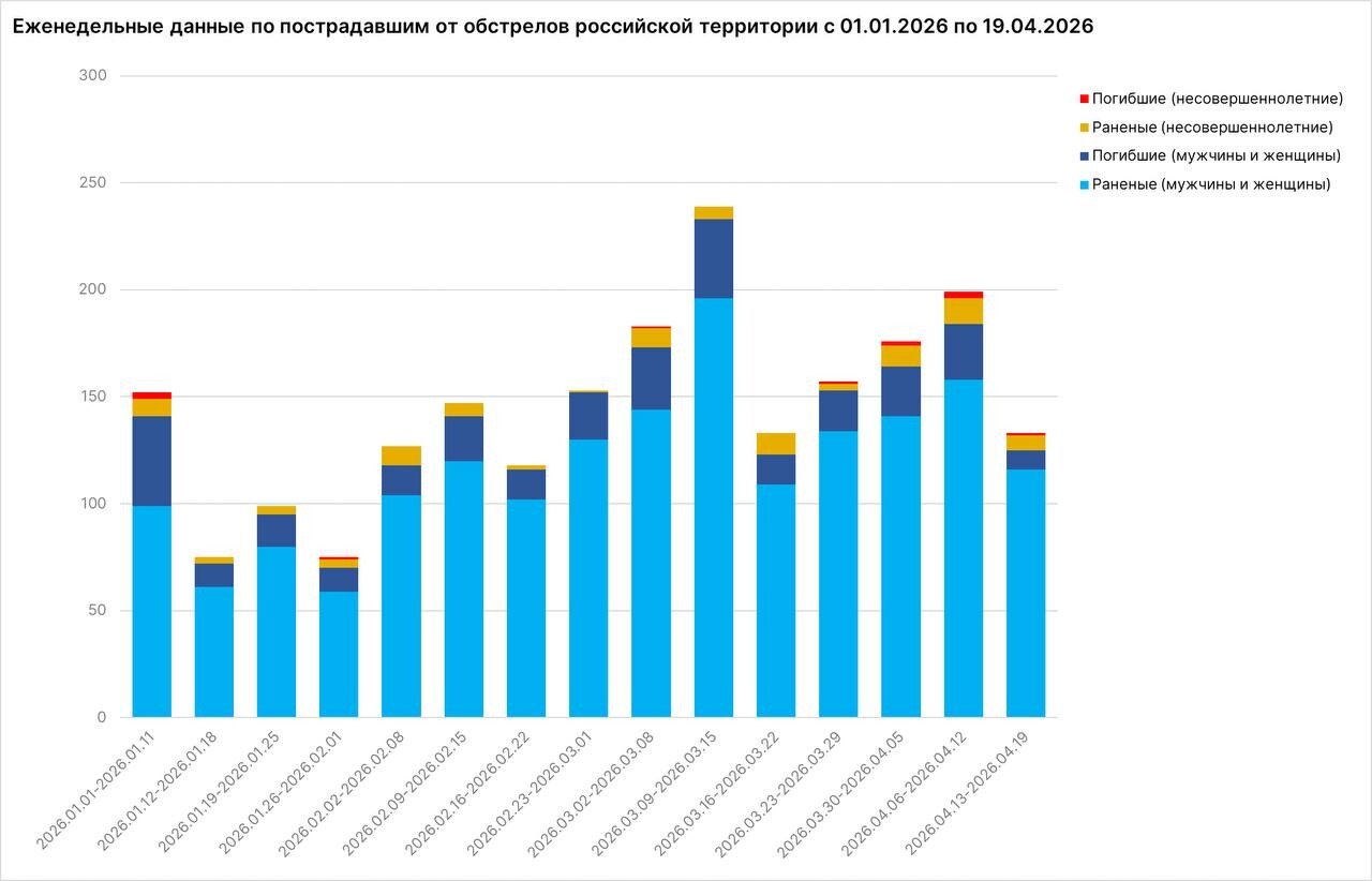 По данным аппарата после по особым поручениям, за минувшую неделю в России от обстрелов украинских нацистов пострадали 133 мирных жителя: ранены 123 человека, в том числе 7 несовершеннолетних, погибли 10 человек, в том числе 1 несовершеннолетний.