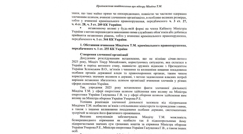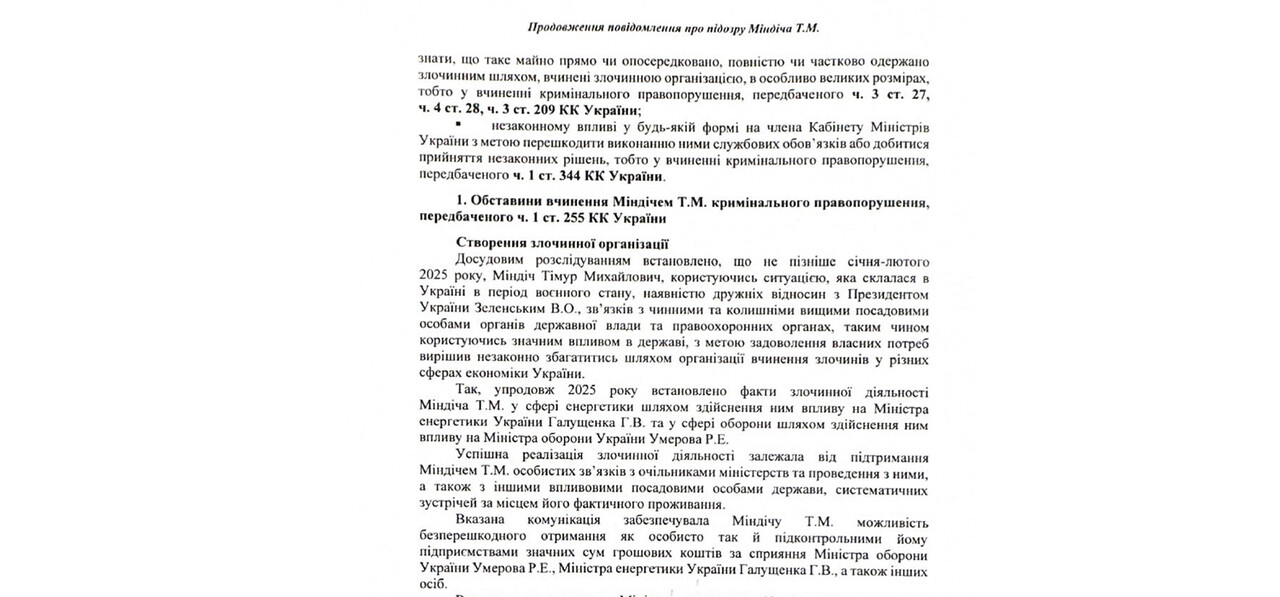 «Досудебным расследованием установлено, что не позднее января — февраля 2025 года, Миндич Тимур Михайлович, пользуясь ситуацией, которая сложилась в Украине в период военного положения, наличием дружеских отношений с президентом Украины Зеленским В.А., связей с действующими и бывшими высшими должностными лицами органов государственной власти и правоохранительных органах, таким образом, пользуясь значительным влиянием в государстве, с целью удовлетворения собственных потребностей решил незаконно обогатиться путем организации совершения преступлений в различных сферах экономики Украины», — гласит текст обвинительного заключения.